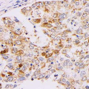 IHC检测ASK1蛋白(货号 GB115481). 样品: 人肺癌, 4%多聚甲醛 (货号G1101) 固定12-24小时. 抗原修复: 柠檬酸抗原修复液(干粉, pH 6.0) (G1201), 98℃, 20分钟. —抗: 1: 500稀释, 4℃ 孵育过夜. 二抗: HRP标记山羊抗兔IgG (H+L) (货号GB23303), 1: 200稀释, 室温孵育1小时. |