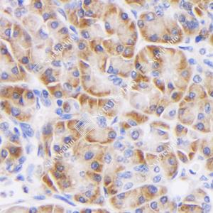 IHC检测ASK1蛋白(货号 GB115481). 样品: 人胰腺, 4%多聚甲醛 (货号G1101) 固定12-24小时. 抗原修复: 柠檬酸抗原修复液(干粉, pH 6.0) (G1201), 98℃, 20分钟. —抗: 1: 500稀释, 4℃ 孵育过夜. 二抗: HRP标记山羊抗兔IgG (H+L) (货号GB23303), 1: 200稀释, 室温孵育1小时. |