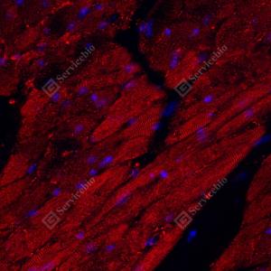 IF检测ASK1蛋白(货号 GB115481)(红色). 样品: 小鼠心, 4%多聚甲醛 (货号G1101) 固定12-24小时. 抗原修复: Tris-EDTA抗原修复液(pH 9.0) (G1203), 98℃, 20分钟. 封闭: 3% BSA(货号GC305010)的PBS溶液, 室温孵育30分钟. —抗: 1: 500稀释, 4℃ 孵育过夜. 二抗: Cy3标记山羊抗兔IgG (H+L) (货号GB21303), 1: 300稀释, 室温孵育1小时. |
