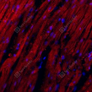 IF检测ASK1蛋白(货号 GB115481)(红色). 样品: 大鼠心, 4%多聚甲醛 (货号G1101) 固定12-24小时. 抗原修复: Tris-EDTA抗原修复液(pH 9.0) (G1203), 98℃, 20分钟. 封闭: 3% BSA(货号GC305010)的PBS溶液, 室温孵育30分钟. —抗: 1: 500稀释, 4℃ 孵育过夜. 二抗: Cy3标记山羊抗兔IgG (H+L) (货号GB21303), 1: 300稀释, 室温孵育1小时. |