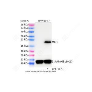 | WB检测MCP1蛋白(货号 GB153239). 样品: 经RIPA裂解液(货号G2002)处理的蛋白质. 封闭: 3%脱脂牛奶(货号GC310001)溶于TBST溶液, 室温孵育1小时. —抗: 1: 1000稀释, 4℃ 孵育过夜. 二抗: HRP标记山羊抗大鼠IgG (H+L) (货号GB23302), 1: 5000稀释, 室温孵育1小时. |