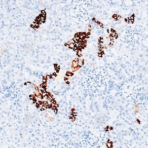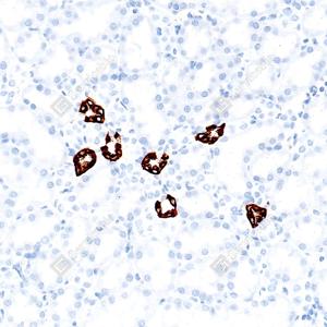 | IHC检测Aquaporin 2蛋白(货号 GB155729). 样品: 大鼠肾, 4%多聚甲醛 (货号G1101) 固定12-24小时. 抗原修复: 抗原修复仪(货号 ARI-4), Tris-EDTA抗原修复液(pH 9.0) (货号G1203), 水浴98℃, 20分钟. —抗: 1: 1000稀释, 4℃ 孵育过夜. 二抗: S-vision免疫组化多聚二抗(山羊抗兔),即用型 (货号G1302), 室温孵育20分钟. |