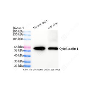 | WB检测Cytokeratin 1蛋白(货号 GB150184). 样品: 经RIPA裂解液(货号G2002)处理的蛋白质. 封闭: 3%脱脂牛奶(货号GC310001)溶于TBST溶液, 室温孵育1小时. —抗: 1: 1000稀释, 4℃ 孵育过夜. 二抗: HRP标记山羊抗大鼠IgG (H+L) (货号GB23302), 1: 5000稀释, 室温孵育1小时. |
