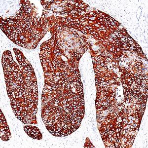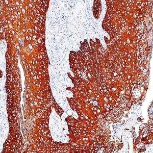 | IHC检测Cytokeratin 1蛋白(货号 GB150183). 样品: 人食管鳞状细胞癌, 4%多聚甲醛 (货号G1101) 固定12-24小时. 抗原修复: 抗原修复仪(货号 ARI-4),柠檬酸抗原修复液(干粉, pH 6.0) (G1201), 100℃, 25分钟. —抗: 1: 1000稀释, 4℃ 孵育过夜. 二抗: S-vision免疫组化多聚二抗(山羊抗小鼠), 即用型(货号G1301), 室温孵育20分钟. |