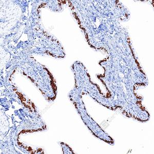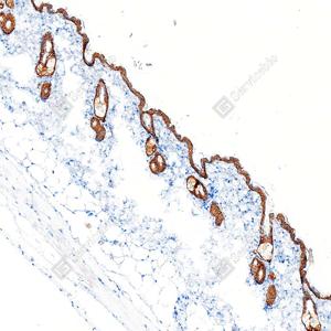 | IHC检测Cytokeratin 1蛋白(货号 GB150183). 样品: 小鼠膀胱, 4%多聚甲醛 (货号G1101) 固定12-24小时. 抗原修复: 抗原修复仪(货号 ARI-4),柠檬酸抗原修复液(干粉, pH 6.0) (G1201), 100℃, 25分钟. —抗: 1: 1000稀释, 4℃ 孵育过夜. 二抗: S-vision免疫组化多聚二抗(山羊抗小鼠), 即用型(货号G1301), 室温孵育20分钟. |