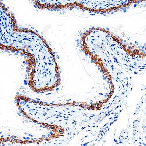 | IHC检测Cytokeratin 1蛋白(货号 GB150183). 样品: 大鼠膀胱, 4%多聚甲醛 (货号G1101) 固定12-24小时. 抗原修复: 抗原修复仪(货号 ARI-4),柠檬酸抗原修复液(干粉, pH 6.0) (G1201), 100℃, 25分钟. —抗: 1: 1000稀释, 4℃ 孵育过夜. 二抗: S-vision免疫组化多聚二抗(山羊抗小鼠), 即用型(货号G1301), 室温孵育20分钟. |