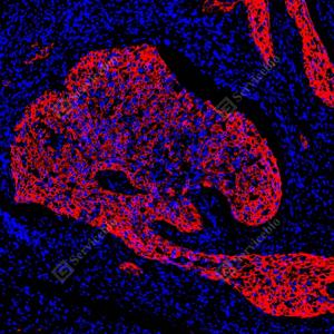 | IF检测Cytokeratin 1蛋白(货号 GB150183)(红色). 样品: 人肺鳞癌, 4%多聚甲醛 (货号G1101) 固定12-24小时. 抗原修复: 抗原修复仪(货号 ARI-4),柠檬酸抗原修复液(干粉, pH 6.0) (G1201), 100℃, 25分钟. 封闭: 3% BSA(货号GC305010)的PBS溶液, 室温孵育30分钟. —抗: 1: 1000稀释, 4℃ 孵育过夜. 二抗: Cy3标记山羊抗小鼠IgG (H+L) (货号GB21301), 1: 300稀释, 室温孵育1小时. |