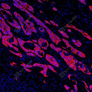 | IF检测Cytokeratin 1蛋白(货号 GB150183)(红色). 样品: 人宫颈癌, 4%多聚甲醛 (货号G1101) 固定12-24小时. 抗原修复: 抗原修复仪(货号 ARI-4),柠檬酸抗原修复液(干粉, pH 6.0) (G1201), 100℃, 25分钟. 封闭: 3% BSA(货号GC305010)的PBS溶液, 室温孵育30分钟. —抗: 1: 1000稀释, 4℃ 孵育过夜. 二抗: Cy3标记山羊抗小鼠IgG (H+L) (货号GB21301), 1: 300稀释, 室温孵育1小时. |