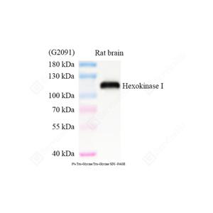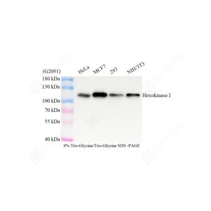 | WB检测Hexokinase 1蛋白(货号 GB150134). 样品: 经RIPA裂解液(货号G2002)处理的蛋白质. 封闭: 3%脱脂牛奶(货号GC310001)溶于TBST溶液, 室温孵育1小时. —抗: 1: 1000稀释, 4℃ 孵育过夜. 二抗: HRP标记山羊抗兔IgG (H+L) (货号GB23303), 1: 5000稀释, 室温孵育1小时. |