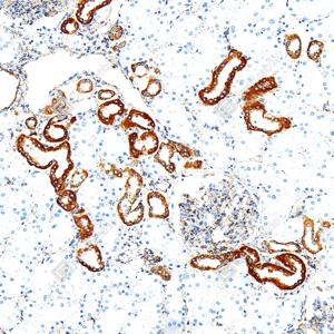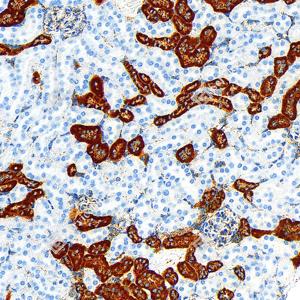 | IHC检测Hexokinase 1蛋白(货号 GB150134). 样品: 人肾, 4%多聚甲醛 (货号G1101) 固定12-24小时. 抗原修复: 抗原修复仪 (货号 ARI-4),Tris-EDTA抗原修复液(pH 9.0) (货号G1203), 水浴100℃, 25分钟. —抗: 1: 500稀释, 4℃ 孵育过夜. 二抗: S-vision免疫组化多聚二抗(山羊抗兔),即用型 (货号G1302), 室温孵育20分钟. |