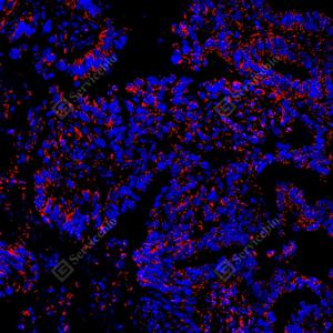 | IF检测Hexokinase 1蛋白(货号 GB150134)(红色). 样品: 人肺癌, 4%多聚甲醛 (货号G1101) 固定12-24小时. 抗原修复: 抗原修复仪 (货号 ARI-4),Tris-EDTA抗原修复液(pH 9.0) (货号G1203), 水浴90℃, 30分钟. 封闭: 3% BSA(货号GC305010)的PBS溶液, 室温孵育30分钟. —抗: 1: 500稀释, 4℃ 孵育过夜. 二抗: Cy3标记山羊抗兔IgG (H+L) (货号GB21303), 1: 300稀释, 室温孵育1小时. |