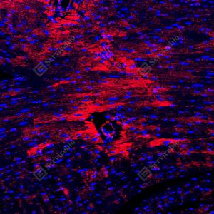 | IF检测Hexokinase 1蛋白(货号 GB150134)(红色). 样品: 小鼠心, 4%多聚甲醛 (货号G1101) 固定12-24小时. 抗原修复: 抗原修复仪 (货号 ARI-4),Tris-EDTA抗原修复液(pH 9.0) (货号G1203), 水浴90℃, 30分钟. 封闭: 3% BSA(货号GC305010)的PBS溶液, 室温孵育30分钟. —抗: 1: 500稀释, 4℃ 孵育过夜. 二抗: Cy3标记山羊抗兔IgG (H+L) (货号GB21303), 1: 300稀释, 室温孵育1小时. |