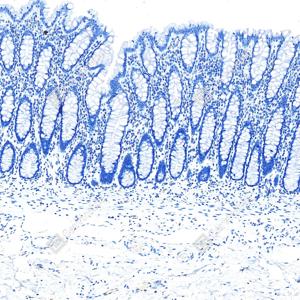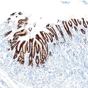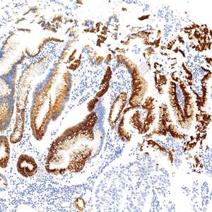 | IHC检测MUC5AC蛋白(货号 GB150127). 样品: 人结肠, 4%多聚甲醛 (货号G1101) 固定12-24小时. 抗原修复: Tris-EDTA抗原修复液(pH 9.0) (G1203), 100℃, 25分钟. —抗: 1: 1000稀释, 4℃ 孵育过夜. 二抗: S-vision免疫组化多聚二抗(山羊抗小鼠), 即用型(货号G1301), 室温孵育20分钟. |