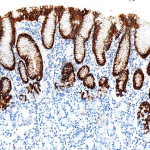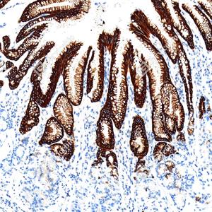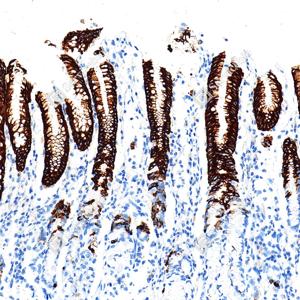 | IHC检测MUC5AC蛋白(货号 GB150127). 样品: 人胃, 4%多聚甲醛 (货号G1101) 固定12-24小时. 抗原修复: Tris-EDTA抗原修复液(pH 9.0) (G1203), 100℃, 25分钟. —抗: 1: 1000稀释, 4℃ 孵育过夜. 二抗: S-vision免疫组化多聚二抗(山羊抗小鼠), 即用型(货号G1301), 室温孵育20分钟. |