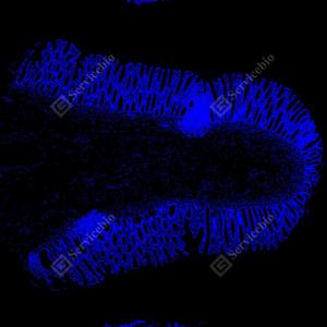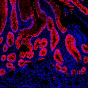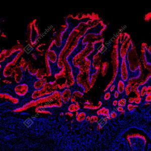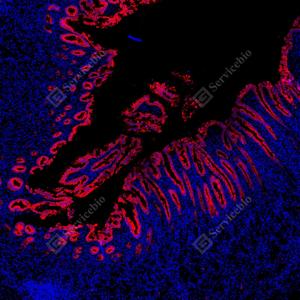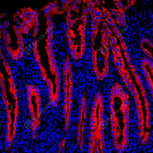 | IF检测MUC5AC蛋白(货号 GB150127)(红色). 样品: 人结肠, 4%多聚甲醛 (货号G1101) 固定12-24小时. 抗原修复: Tris-EDTA抗原修复液(pH 9.0) (G1203), 100℃, 25分钟. 封闭: 3% BSA(货号GC305010)的PBS溶液, 室温孵育30分钟. —抗: 1: 1000稀释, 4℃ 孵育过夜. 二抗: Cy3标记山羊抗小鼠IgG (H+L) (货号GB21301), 1: 300稀释, 室温孵育1小时. |
