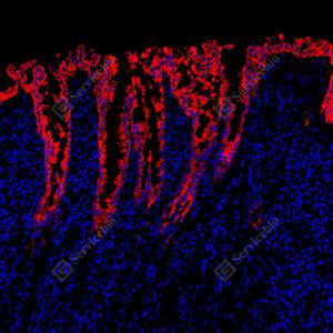 | IF检测MUC5AC蛋白(货号 GB150127)(红色). 样品: 人胃, 4%多聚甲醛 (货号G1101) 固定12-24小时. 抗原修复: Tris-EDTA抗原修复液(pH 9.0) (G1203), 100℃, 25分钟. 封闭: 3% BSA(货号GC305010)的PBS溶液, 室温孵育30分钟. —抗: 1: 1000稀释, 4℃ 孵育过夜. 二抗: Cy3标记山羊抗小鼠IgG (H+L) (货号GB21301), 1: 300稀释, 室温孵育1小时. |