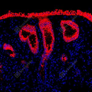 | IF检测MUC5AC蛋白(货号 GB150127)(红色). 样品: 人胃癌, 4%多聚甲醛 (货号G1101) 固定12-24小时. 抗原修复: Tris-EDTA抗原修复液(pH 9.0) (G1203), 100℃, 25分钟. 封闭: 3% BSA(货号GC305010)的PBS溶液, 室温孵育30分钟. —抗: 1: 1000稀释, 4℃ 孵育过夜. 二抗: Cy3标记山羊抗小鼠IgG (H+L) (货号GB21301), 1: 300稀释, 室温孵育1小时. |
