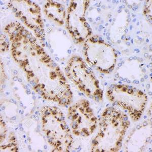 IHC检测NAPSIN-A蛋白(货号 GB121012). 样品: 人肾, 4%多聚甲醛 (货号G1101) 固定12-24小时. 抗原修复: 柠檬酸抗原修复液(干粉, pH 6.0) (G1201), 高压锅均匀喷气计时2分钟. —抗: 1: 1000稀释, 4℃ 孵育过夜. 二抗: HRP标记山羊抗小鼠IgG (H+L) (货号GB23301), 1: 200稀释, 室温孵育1小时. |