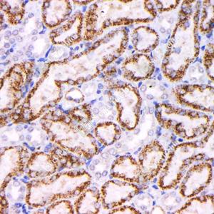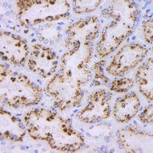 IHC检测NAPSIN-A蛋白(货号 GB121012). 样品: 大鼠肾, 4%多聚甲醛 (货号G1101) 固定12-24小时. 抗原修复: 柠檬酸抗原修复液(干粉, pH 6.0) (G1201), 高压锅均匀喷气计时2分钟. —抗: 1: 1000稀释, 4℃ 孵育过夜. 二抗: HRP标记山羊抗小鼠IgG (H+L) (货号GB23301), 1: 200稀释, 室温孵育1小时. |