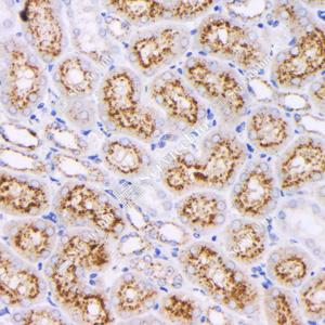 IHC检测NAPSIN-A蛋白(货号 GB121012). 样品: 小鼠肾, 4%多聚甲醛 (货号G1101) 固定12-24小时. 抗原修复: 柠檬酸抗原修复液(干粉, pH 6.0) (G1201), 高压锅均匀喷气计时2分钟. —抗: 1: 1000稀释, 4℃ 孵育过夜. 二抗: HRP标记山羊抗小鼠IgG (H+L) (货号GB23301), 1: 200稀释, 室温孵育1小时. |