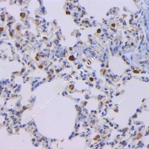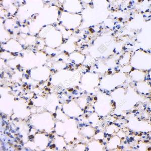 IHC检测NAPSIN-A蛋白(货号 GB121012). 样品: 小鼠肺, 4%多聚甲醛 (货号G1101) 固定12-24小时. 抗原修复: 柠檬酸抗原修复液(干粉, pH 6.0) (G1201), 高压锅均匀喷气计时2分钟. —抗: 1: 1000稀释, 4℃ 孵育过夜. 二抗: HRP标记山羊抗小鼠IgG (H+L) (货号GB23301), 1: 200稀释, 室温孵育1小时. |