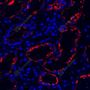 IF检测NAPSIN-A蛋白(货号 GB121012)(红色). 样品: 小鼠肾, 4%多聚甲醛 (货号G1101) 固定12-24小时. 抗原修复: 柠檬酸抗原修复液(干粉, pH 6.0) (G1201), 高压锅均匀喷气计时2分钟. 封闭: 3% BSA(货号GC305010)的PBS溶液, 室温孵育30分钟. —抗: 1: 500稀释, 4℃ 孵育过夜. 二抗: Cy3标记山羊抗小鼠IgG (H+L) (货号GB21301), 1: 300稀释, 室温孵育1小时. |