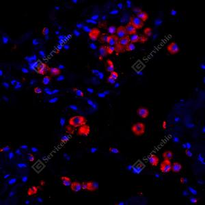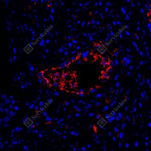 IF检测NAPSIN-A蛋白(货号 GB121012)(红色). 样品: 小鼠肺, 4%多聚甲醛 (货号G1101) 固定12-24小时. 抗原修复: 柠檬酸抗原修复液(干粉, pH 6.0) (G1201), 高压锅均匀喷气计时2分钟. 封闭: 3% BSA(货号GC305010)的PBS溶液, 室温孵育30分钟. —抗: 1: 500稀释, 4℃ 孵育过夜. 二抗: Cy3标记山羊抗小鼠IgG (H+L) (货号GB21301), 1: 300稀释, 室温孵育1小时. |