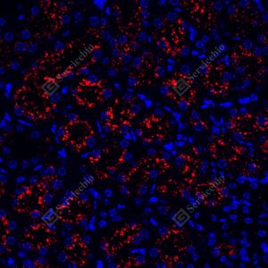 IF检测NAPSIN-A蛋白(货号 GB121012)(红色). 样品: 人肾, 4%多聚甲醛 (货号G1101) 固定12-24小时. 抗原修复: 柠檬酸抗原修复液(干粉, pH 6.0) (G1201), 高压锅均匀喷气计时2分钟. 封闭: 3% BSA(货号GC305010)的PBS溶液, 室温孵育30分钟. —抗: 1: 500稀释, 4℃ 孵育过夜. 二抗: Cy3标记山羊抗小鼠IgG (H+L) (货号GB21301), 1: 300稀释, 室温孵育1小时. |