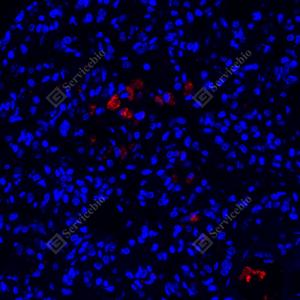 IF检测NAPSIN-A蛋白(货号 GB121012)(红色). 样品: 人肺癌, 4%多聚甲醛 (货号G1101) 固定12-24小时. 抗原修复: 柠檬酸抗原修复液(干粉, pH 6.0) (G1201), 高压锅均匀喷气计时2分钟. 封闭: 3% BSA(货号GC305010)的PBS溶液, 室温孵育30分钟. —抗: 1: 500稀释, 4℃ 孵育过夜. 二抗: Cy3标记山羊抗小鼠IgG (H+L) (货号GB21301), 1: 300稀释, 室温孵育1小时. |