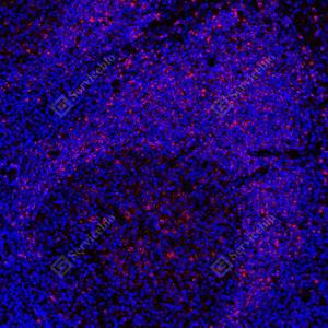 | IF检测CD22蛋白(货号 GB155558)(红色). 样品: 人扁桃体, 4%多聚甲醛 (货号G1101) 固定12-24小时. 抗原修复: Tris-EDTA抗原修复液(pH 9.0) (G1203), 100℃, 25分钟. 封闭: 3% BSA(货号GC305010)的PBS溶液, 室温孵育30分钟. —抗: 1: 2000稀释, 4℃ 孵育过夜. 二抗: Cy3标记山羊抗兔IgG (H+L) (货号GB21303), 1: 300稀释, 室温孵育1小时. |