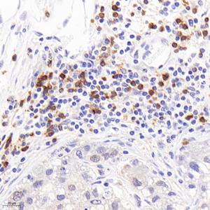 | IHC检测CD22蛋白(货号 GB115558). 样品: 人胃癌, 4%多聚甲醛 (货号G1101) 固定12-24小时. 抗原修复: 柠檬酸抗原修复液(干粉, pH 6.0) (G1201), 98℃, 20分钟. —抗: 1: 500稀释, 4℃ 孵育过夜. 二抗: HRP标记山羊抗兔IgG (H+L) (货号GB23303), 1: 200稀释, 室温孵育1小时. |