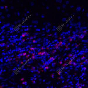 | IF检测CD22蛋白(货号 GB115558)(红色). 样品: 人肝, 4%多聚甲醛 (货号G1101) 固定12-24小时. 抗原修复: Tris-EDTA抗原修复液(pH 9.0) (G1203), 98℃, 20分钟. 封闭: 3% BSA(货号GC305010)的PBS溶液, 室温孵育30分钟. —抗: 1: 500稀释, 4℃ 孵育过夜. 二抗: Cy3标记山羊抗兔IgG (H+L) (货号GB21303), 1: 300稀释, 室温孵育1小时. |