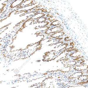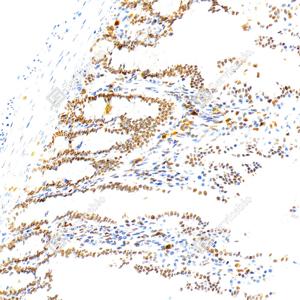 IHC检测PMS2蛋白(货号 GB150071). 样品: 大鼠结肠, 4%多聚甲醛 (货号G1101) 固定12-24小时. 抗原修复: Tris-EDTA抗原修复液(pH 9.0) (G1203), 98℃, 20分钟. —抗: 1: 1000稀释, 4℃ 孵育过夜. 二抗: S-vision免疫组化多聚二抗(山羊抗小鼠), 即用型(货号G1301), 室温孵育20分钟. |