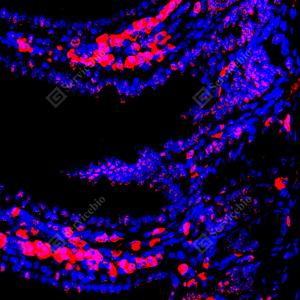 IF检测 PMS2蛋白(货号 GB150071)(红色). 样品: 小鼠结肠, 4%多聚甲醛 (货号G1101) 固定12-24小时. 抗原修复: Tris-EDTA抗原修复液(pH 9.0) (G1203), 98℃, 20分钟. —抗: 1: 1500稀释, 4℃ 孵育过夜. 二抗: Cy3标记山羊抗小鼠IgG (H+L) (货号GB21301), 1: 300稀释, 室温孵育1小时. |