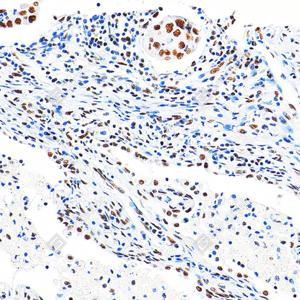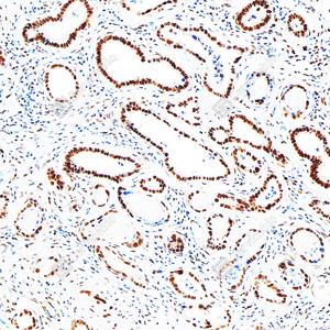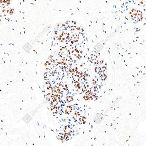 IHC检测PMS2蛋白(货号 GB150011). 样品: 人乳腺癌, 4%多聚甲醛 (货号G1101) 固定12-24小时. 抗原修复: Tris-EDTA抗原修复液(pH 9.0) (G1203), 98℃, 20分钟. —抗: 1: 500稀释, 4℃ 孵育过夜. 二抗: S-vision免疫组化多聚二抗(山羊抗兔),即用型 (货号G1302), 室温孵育20分钟. |
