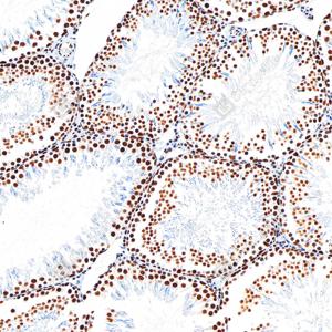 IHC检测PMS2蛋白(货号 GB150011). 样品: 大鼠睾丸, 4%多聚甲醛 (货号G1101) 固定12-24小时. 抗原修复: Tris-EDTA抗原修复液(pH 9.0) (G1203), 98℃, 20分钟. —抗: 1: 500稀释, 4℃ 孵育过夜. 二抗: S-vision免疫组化多聚二抗(山羊抗兔),即用型 (货号G1302), 室温孵育20分钟. |