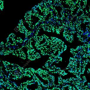 IF检测PMS2蛋白(货号 GB150011)(绿色). 样品: 人子宫内膜癌, 4%多聚甲醛 (货号G1101) 固定12-24小时. 抗原修复: Tris-EDTA抗原修复液(pH 9.0) (G1203), 98℃, 20分钟. 封闭: 3% BSA(货号GC305010)的PBS溶液, 室温孵育30分钟. —抗: 1: 500稀释, 4℃ 孵育过夜. 二抗: Alexa Fluor 488标记山羊抗兔IgG (H+L) (货号GB25303), 1: 400稀释, 室温孵育1小时. |