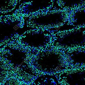 IF检测PMS2蛋白(货号 GB150011)(绿色). 样品: 大鼠睾丸, 4%多聚甲醛 (货号G1101) 固定12-24小时. 抗原修复: Tris-EDTA抗原修复液(pH 9.0) (G1203), 98℃, 20分钟. 封闭: 3% BSA(货号GC305010)的PBS溶液, 室温孵育30分钟. —抗: 1: 500稀释, 4℃ 孵育过夜. 二抗: Alexa Fluor 488标记山羊抗兔IgG (H+L) (货号GB25303), 1: 400稀释, 室温孵育1小时. |