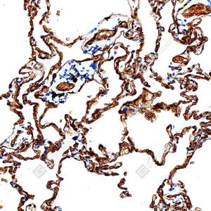 | IHC检测AQP1蛋白(货号 GB150114). 样品: 人肺, 4%多聚甲醛 (货号G1101) 固定12-24小时. 抗原修复: Tris-EDTA抗原修复液(pH 9.0) (G1203), 100℃, 25分钟. —抗: 1: 1000稀释, 4℃ 孵育过夜. 二抗: S-vision免疫组化多聚二抗(山羊抗兔),即用型 (货号G1302), 室温孵育20分钟. |