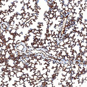| IHC检测AQP1蛋白(货号 GB150114). 样品: 大鼠肺, 4%多聚甲醛 (货号G1101) 固定12-24小时. 抗原修复: Tris-EDTA抗原修复液(pH 9.0) (G1203), 100℃, 25分钟. —抗: 1: 1000稀释, 4℃ 孵育过夜. 二抗: S-vision免疫组化多聚二抗(山羊抗兔),即用型 (货号G1302), 室温孵育20分钟. |