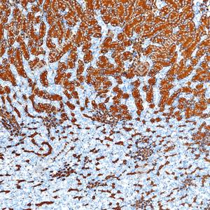 | IHC检测AQP1蛋白(货号 GB150114). 样品: 小鼠肾, 4%多聚甲醛 (货号G1101) 固定12-24小时. 抗原修复: Tris-EDTA抗原修复液(pH 9.0) (G1203), 100℃, 25分钟. —抗: 1: 1000稀释, 4℃ 孵育过夜. 二抗: S-vision免疫组化多聚二抗(山羊抗兔),即用型 (货号G1302), 室温孵育20分钟. |