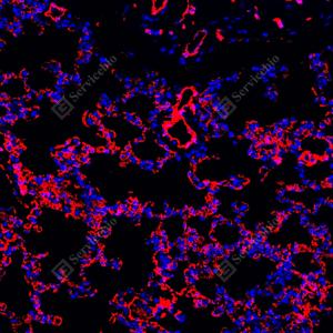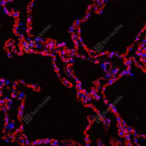 | IF检测AQP1蛋白(货号 GB150114)(红色). 样品: 大鼠肺, 4%多聚甲醛 (货号G1101) 固定12-24小时. 抗原修复: Tris-EDTA抗原修复液(pH 9.0) (G1203), 100℃, 25分钟. 封闭: 3% BSA(货号GC305010)的PBS溶液, 室温孵育30分钟. —抗: 1: 1000稀释, 4℃ 孵育过夜. 二抗: Cy3标记山羊抗兔IgG (H+L) (货号GB21303), 1: 300稀释, 室温孵育1小时. |