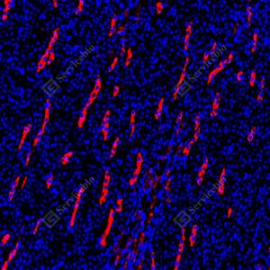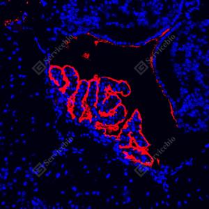 | IF检测AQP1蛋白(货号 GB150114)(红色). 样品: 大鼠肾, 4%多聚甲醛 (货号G1101) 固定12-24小时. 抗原修复: Tris-EDTA抗原修复液(pH 9.0) (G1203), 100℃, 25分钟. 封闭: 3% BSA(货号GC305010)的PBS溶液, 室温孵育30分钟. —抗: 1: 1000稀释, 4℃ 孵育过夜. 二抗: Cy3标记山羊抗兔IgG (H+L) (货号GB21303), 1: 300稀释, 室温孵育1小时. |