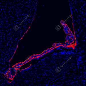 | IF检测AQP1蛋白(货号 GB150114)(红色). 样品: 小鼠脑, 4%多聚甲醛 (货号G1101) 固定12-24小时. 抗原修复: Tris-EDTA抗原修复液(pH 9.0) (G1203), 100℃, 25分钟. 封闭: 3% BSA(货号GC305010)的PBS溶液, 室温孵育30分钟. —抗: 1: 1000稀释, 4℃ 孵育过夜. 二抗: Cy3标记山羊抗兔IgG (H+L) (货号GB21303), 1: 300稀释, 室温孵育1小时. |