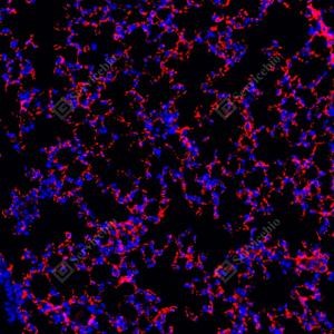 | IF检测AQP1蛋白(货号 GB150114)(红色). 样品: 小鼠肺, 4%多聚甲醛 (货号G1101) 固定12-24小时. 抗原修复: Tris-EDTA抗原修复液(pH 9.0) (G1203), 100℃, 25分钟. 封闭: 3% BSA(货号GC305010)的PBS溶液, 室温孵育30分钟. —抗: 1: 1000稀释, 4℃ 孵育过夜. 二抗: Cy3标记山羊抗兔IgG (H+L) (货号GB21303), 1: 300稀释, 室温孵育1小时. |