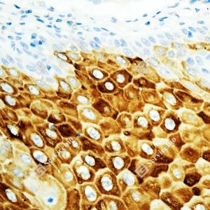 IHC检测Cytokeratin 16/K16蛋白(货号 GB15804). 样品: 人食管癌, 4%多聚甲醛 (货号G1101) 固定12-24小时. 抗原修复: 柠檬酸抗原修复液(干粉, pH 6.0) (G1201), 高压锅均匀喷气计时2分钟. —抗: 1: 1000稀释, 4℃ 孵育过夜. 二抗: HRP标记山羊抗小鼠IgG (H+L) (货号GB23301), 1: 200稀释, 室温孵育1小时. |