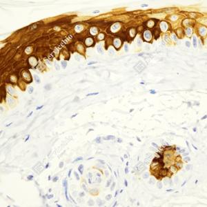 IHC检测Cytokeratin 16/K16蛋白(货号 GB15804). 样品: 小鼠皮肤, 4%多聚甲醛 (货号G1101) 固定12-24小时. 抗原修复: 柠檬酸抗原修复液(干粉, pH 6.0) (G1201), 高压锅均匀喷气计时2分钟. —抗: 1: 1000稀释, 4℃ 孵育过夜. 二抗: HRP标记山羊抗小鼠IgG (H+L) (货号GB23301), 1: 200稀释, 室温孵育1小时. |
