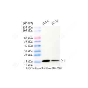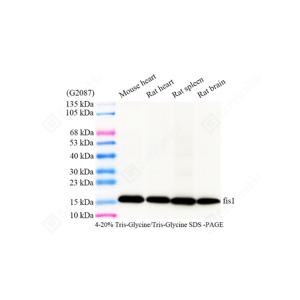 | WB检测FIS1蛋白(货号 GB150136). 样品: 经RIPA裂解液(货号G2002)处理的蛋白质. 封闭: 3%脱脂牛奶(货号GC310001)溶于TBST溶液, 室温孵育1小时. —抗: 1: 1000稀释, 4℃ 孵育过夜. 二抗: HRP标记山羊抗兔IgG (H+L) (货号GB23303), 1: 5000稀释, 室温孵育1小时. |