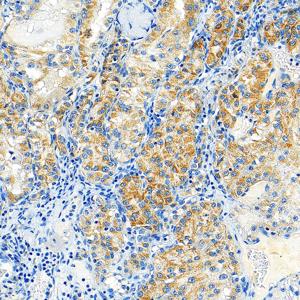 | IHC检测FIS1蛋白(货号 GB150136). 样品: 人肾癌, 4%多聚甲醛 (货号G1101) 固定12-24小时. 抗原修复: 抗原修复仪 (货号 ARI-4),Tris-EDTA抗原修复液(pH 9.0) (货号G1203), 水浴100℃, 25分钟. —抗: 1: 1000稀释, 4℃ 孵育过夜. 二抗: S-vision免疫组化多聚二抗(山羊抗兔),即用型 (货号G1302), 室温孵育20分钟. |