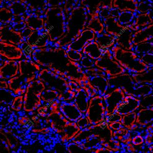 | IF检测FIS1蛋白(货号 GB150136)(红色). 样品: 小鼠肾, 4%多聚甲醛 (货号G1101) 固定12-24小时. 抗原修复: 抗原修复仪 (货号 ARI-4),Tris-EDTA抗原修复液(pH 9.0) (货号G1203), 水浴90℃, 30分钟. 封闭: 3% BSA(货号GC305010)的PBS溶液, 室温孵育30分钟. —抗: 1: 1000稀释, 4℃ 孵育过夜. 二抗: Cy3标记山羊抗兔IgG (H+L) (货号GB21303), 1: 300稀释, 室温孵育1小时. |